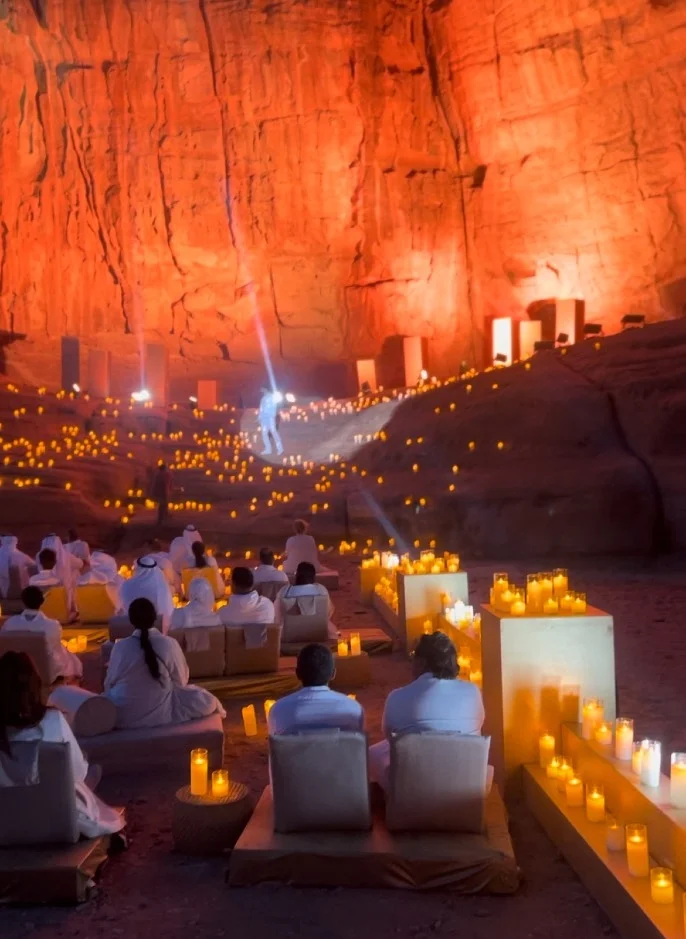 Magical commercial made in the magical mountains of al ULA, where the astonishing model holding AMAFFI perfume goes down in a luxurious air balloon to the unique artist Ibrahim Maalouf who is playing his music in a wonderful dreamy space surrounded by people , candles and romantic magical mood.